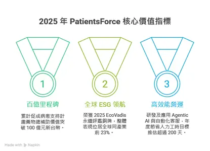 - 百億里程碑: 累計促成病患支持計畫(PSP)藥物總補助價值突破 100 億元新台幣,2025 單年度補助達 23 億元。