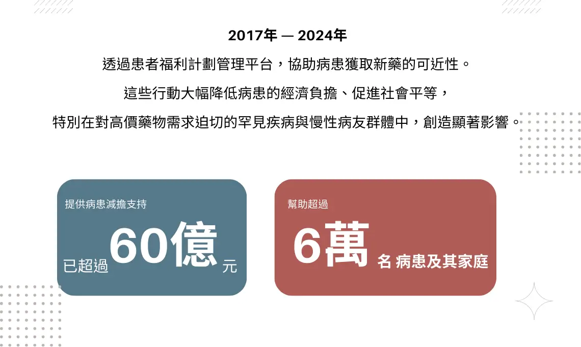 - Reducing the burden on patients: From 2017 to 2024, PatientsForce has completed more than NT$6 billion in burden reduction support to help more than 60,000 patients and their families through its patient benefit plan management platform to help patients access new drugs. These actions not only significantly reduce the financial burden on patients, but also promote social equality, especially among rare diseases and chronic patients who have a strong need for high-priced drugs.