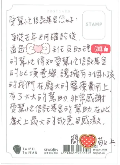 He has three young children aged 1-7 years. On weekdays, he lives in Kaohsiung, accompanied by his husband to the north for treatment, during which his in-laws or mother-in-law take turns to help take care of the children